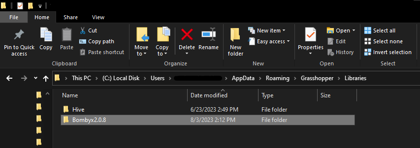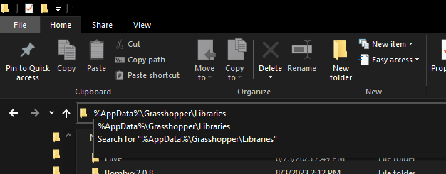 <figure><img src="https://2247841109-files.gitbook.io/~/files/v0/b/gitbook-x-prod.appspot.com/o/spaces%2FkTnZDnMljJFH2G5AbyGy%2Fuploads%2FtPPa6RB083Q4DYZfqESx%2Fimage.png?alt=media&#x26;token=99fe8ab3-e932-447a-a5b4-64c10e5da409" alt=""><figcaption><p>Grasshopper Libraries Folder</p></figcaption></figure>